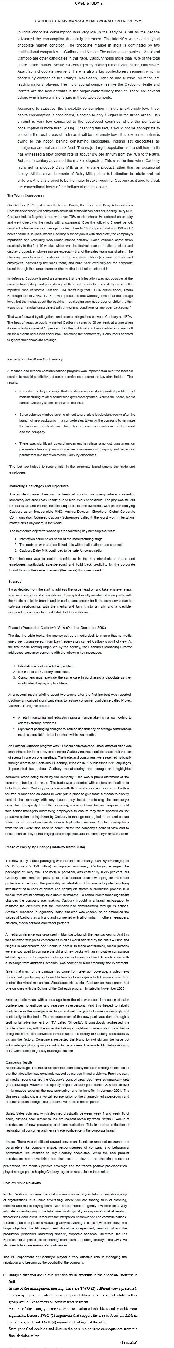 Case Study 2 Cadbury Crisis Management Worm Contr Chegg Com - Recently there was a crisis that cadbury's had had to resolve when it was reported that worms were found in a few of the cadbury's chocolates.since then the company has invested in upgrading packaging facilities and in.