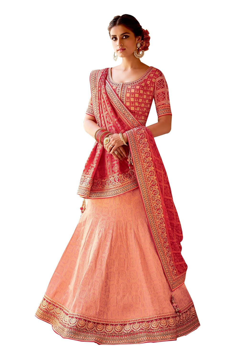 Red And Peach Lehenga Red And Peach Lehenga / Dry clean only please contact us for any customization.